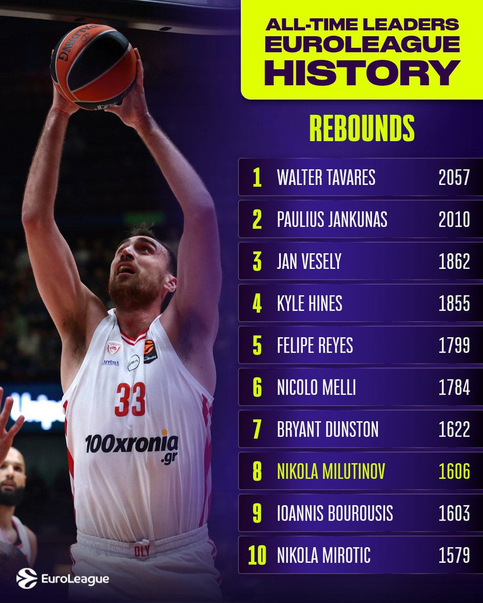 📈 Nikola Milutinov climbs the boards and into history, passing the legendary Ioannis Bourousis for 8th all-time in rebounds!